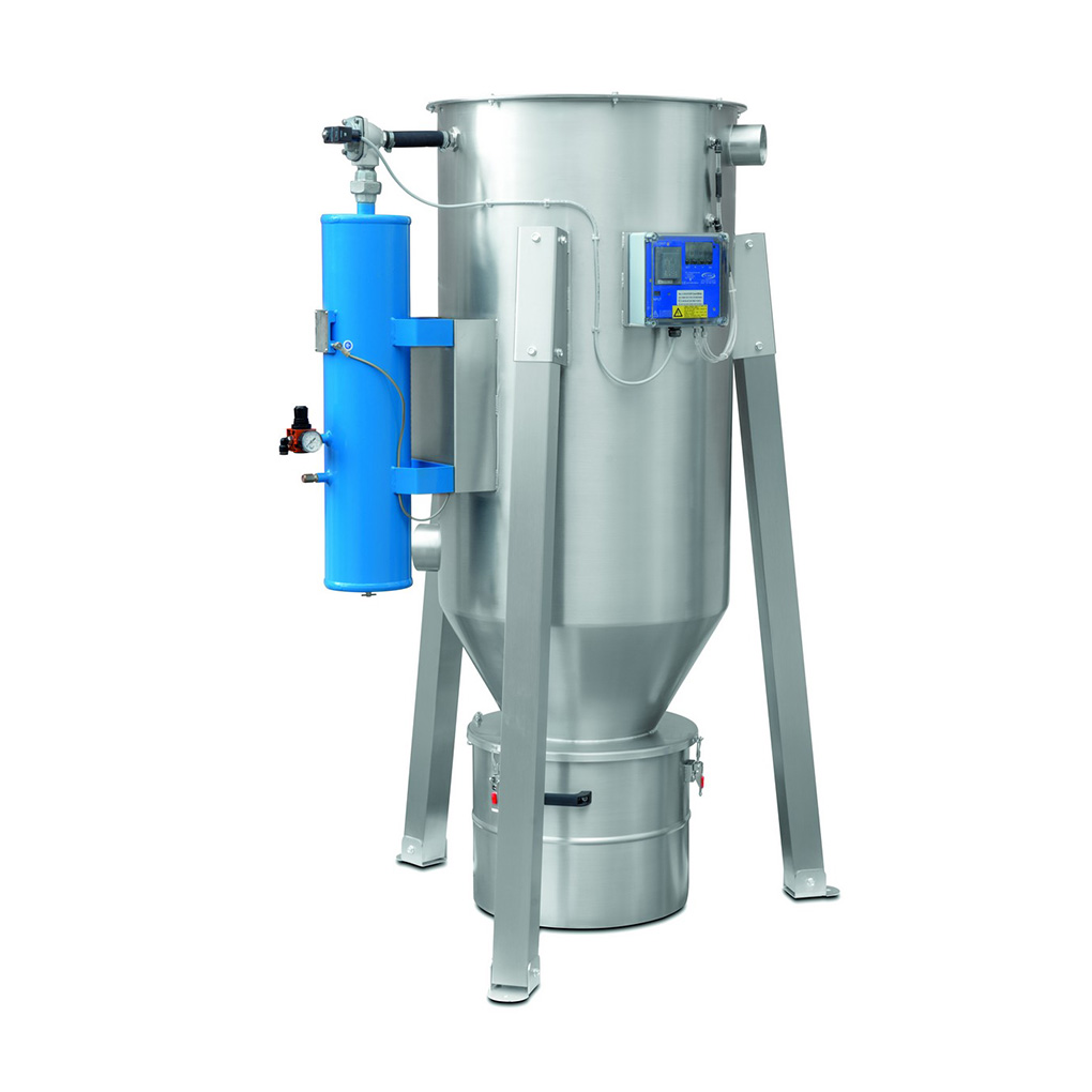 ATEX-zertifizierte Filtereinheit für ZONE II 3D. Zum Anschluss an eine vorhandene Hochdruck-Saugleitung. Struktur aus EDELSTAHL AISI 304; die Filterpatrone wird mittels einer pneumatischen Düse gereinigt, die vom Druckluftbehälter versorgt wird. Die Reinigungsintervalle werden durch einen an einen Delta-P-Sensor angeschlossenen Economizer definiert, um den Reinigungszyklus nur bei Bedarf zu aktivieren. Der vom Trichter gesammelte Staub wird in den darunter liegenden Staubbehälter befördert.