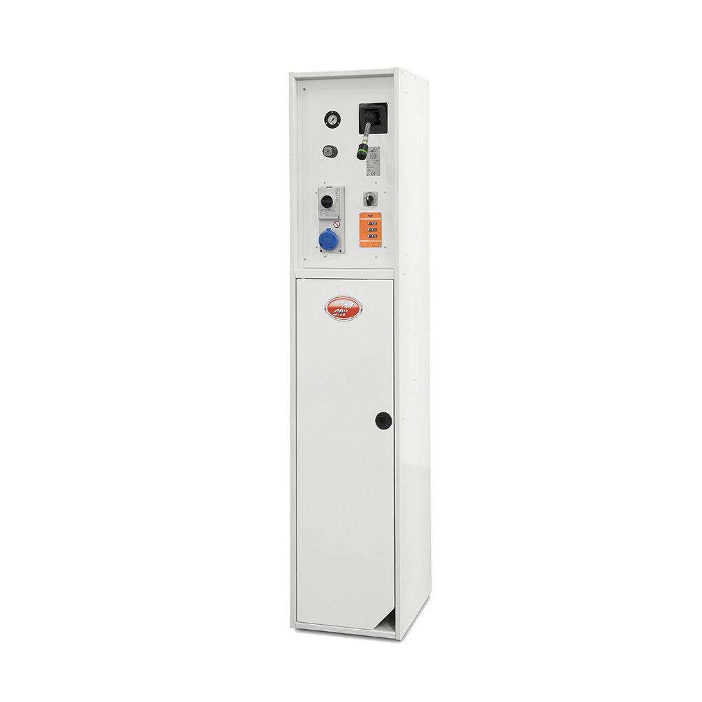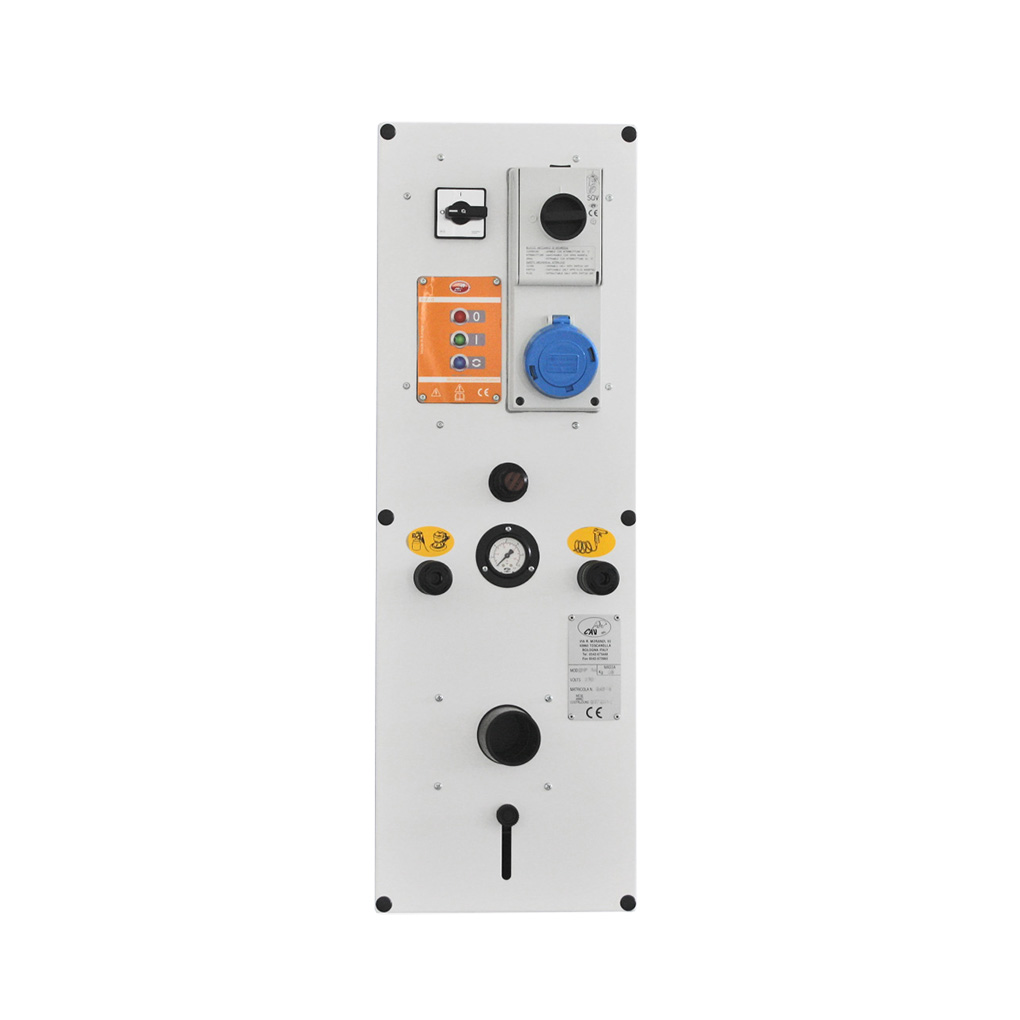 In eine Kabinenwand integrierbares Absaugterminal, versorgt die Arbeitsbereiche mit Anschlüssen für die Absaugung, Druckluft und Strom. Die Einschaltautomatik der Turbine funktioniert automatisch beim Einschalten der Schleifmaschine. Der Absaugkanal wird mittels AUTO-CLOSE-SYSTEM automatisch verschlossen, sobald kein Werkzeug verwendet wird.