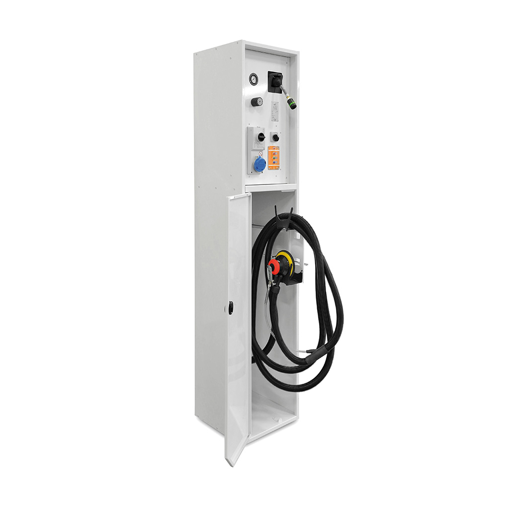 Kompaktes und funktionelles Wandterminal. Der regelbare Druckluftanschluss erlaubt den Anschluss einer Druckluftmaschine direkt am Wandterminal über den Absaugschlauch „Schlauch-in-Schlauch-System“, oder ein elektrisches Schleifwerkzeug direkt an der eingebauten Steckdose. Die Einschaltautomatik der Turbine funktioniert automatisch für Druckluft- und Elektrowerkzeuge über die integrierte Steuerung.