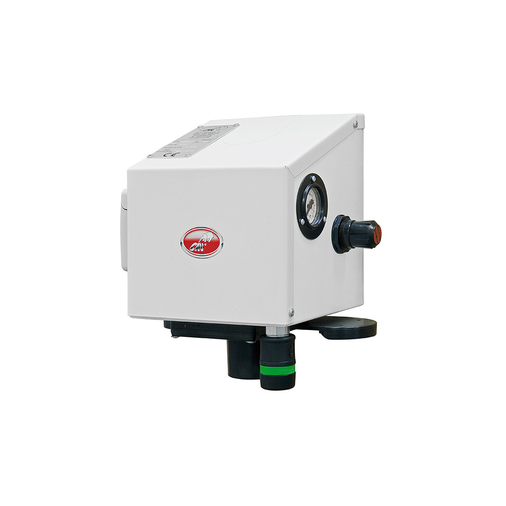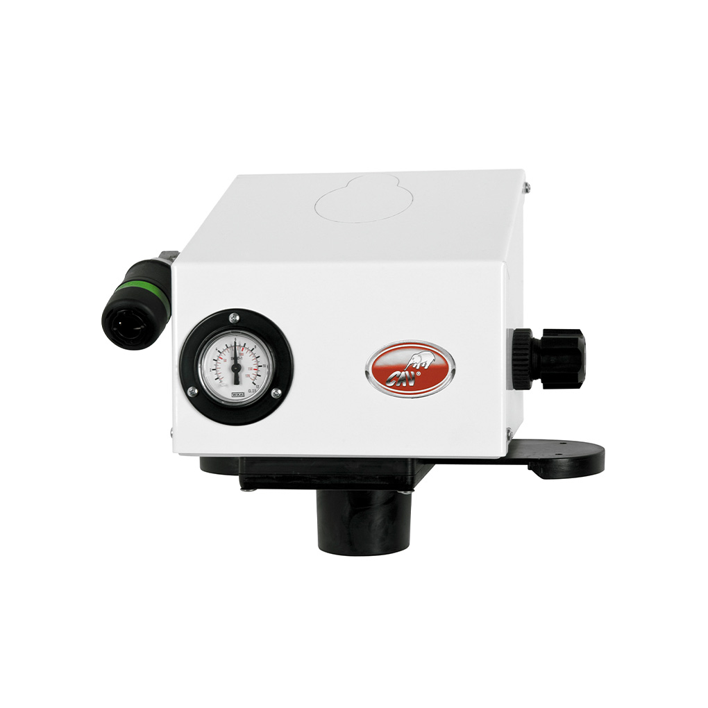 Einfaches und funktionelles Wandterminal. Der Anschluss für einen Absaugschlauch ist mit einer Klappensteuerung (Microswitch) ausgestattet. Sobald die Klappe geöffnet wird, startet die Absaugturbine. Der regelbare Druckluftanschluss erlaubt den Anschluss einer Druckluftmaschine direkt am Wandterminal über den Absaugschlauch „Schlauch-in-Schlauch-System“.